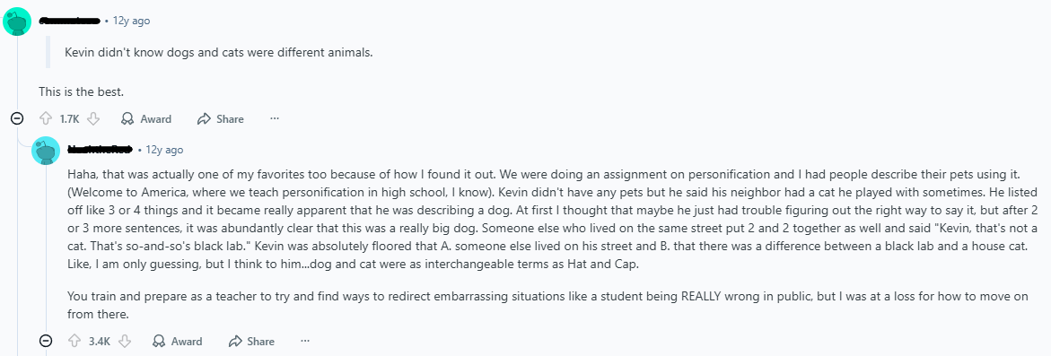 Jaja, esa fue en realidad una de mis favoritas también por cómo me enteré. Estábamos haciendo una tarea sobre la personificación [darle cualidades humanas a un objeto o animal] y pedí que la gente describiera a sus mascotas usándola. (Bienvenidos a Estados Unidos, donde enseñamos personificación en la preparatoria, lo sé). Kevin no tenía mascotas, pero dijo que su vecino tenía un gato con el que jugaba a veces. Enumeró como 3 o 4 cosas y se hizo muy evidente que estaba describiendo a un perro. Al principio pensé que tal vez solo tenía problemas para encontrar la manera correcta de decirlo, pero después de 2 o 3 frases más, estuvo clarísimo que se trataba de un perro realmente grande. Alguien más que vivía en la misma calle también ató cabos y dijo: «Kevin, eso no es un gato. Es el labrador negro de fulano». Kevin se quedó absolutamente atónito de que: